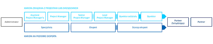 Możecie podążać ścieżką rozwoju w ramach rodziny stanowisk Project Manager’a. Zapewnia to orientację, tworzy przejrzystość i umożliwia systematyczny, a jednocześnie spersonalizowany rozwój. Niezależnie od tego, czy dążycie do objęcia odpowiedzialności na stanowisku zarządzającym, czy też raczej do pogłębiania swojej wiedzy specjalistycznej w określonej dziedzinie – w Dreso możliwe jest kształtowanie kariery, która odpowiada Państwa mocnym stronom i preferencjom.